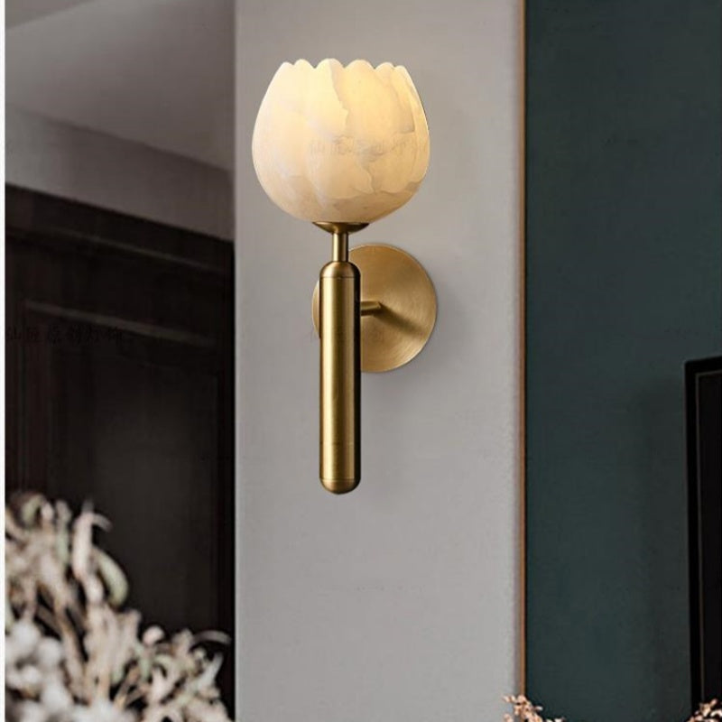 | This sleek, alabaster wall sconce is ideal for the bedroom. Its tulip-shaped design provides a beautiful ambience, making it the perfect choice for a romantic setting. The alabaster finish ensures robustness and durability. Illuminate your bedroom in modern style with this timeless wall sconce. |