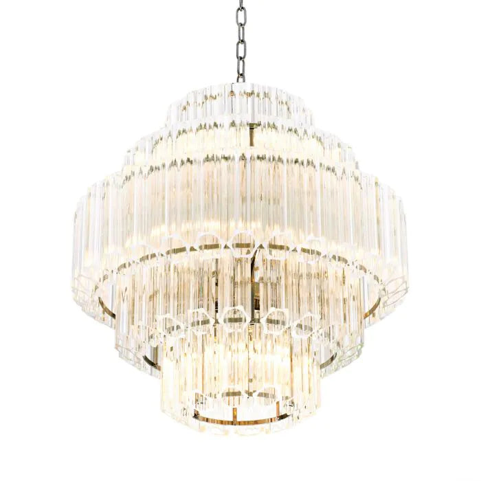 Featuring a dazzling design with ribbed and bevelled clear glass tubes, this lush chandelier creates a stunning glow in any interior it adorns.