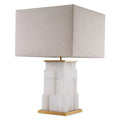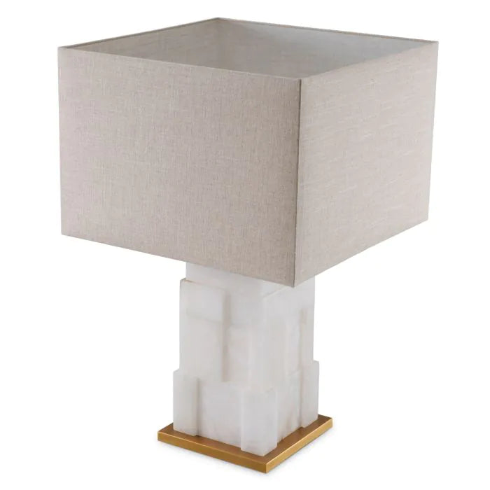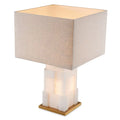 This opulent piece boasts a luminous alabaster base with the option of an internal glow, accentuated by a refined linen-mix shade. Perfectly crafted for those who appreciate timeless luxury, it transforms any space into a haven of serene illumination.