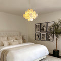 Murano Chandelier 36 White Disks. The chandelier has 36 fantastic iridescent alabaster White discs in a nickel metal frame. This chandelier is more than just a lighting fixture, it's a work of art that illuminates your surroundings.