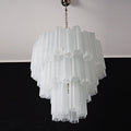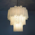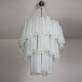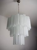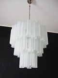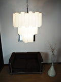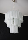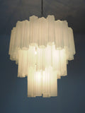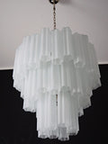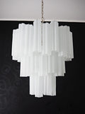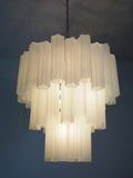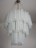Italian chandelier with Murano glass on metal structure. The lamp frame supports 48 large matte white glass tubes in a star shape.