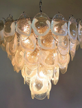 Add elegance to your decor with our Murano chandelier. Crafted in traditional Italian style, this chandelier features 50 exquisite lattimo glasses, also known as ‘shells’, suspended in a sleek chrome frame adorned with 50 finely crafted glasses. This isn’t just a lamp; it’s a captivating piece of art that adds a timeless charm to any room.