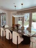 The matte gold metal frame adds a refined touch, while the fine brass balls add a subtle detail. Perfectly placed above a long dining table, this chandelier will not only create an atmosphere of luxury, but also add a touch of Italian style to your decor.