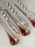 Elevate your space with a touch of vintage charm with our Murano Teardrops chandelier from the 1970s. This exquisite piece exudes timeless elegance with its delicate teardrop-shaped glass elements, meticulously handcrafted in the Murano tradition. Each teardrop reflects the light in a mesmerizing dance, casting a warm and inviting glow throughout the room. Whether suspended over a dining table or gracing a foyer, this chandelier adds a touch of sophistication and history to any interior space.