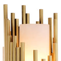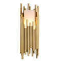 This striking designer lamp features a cylinder shape carved from a block of solid alabaster, surrounded by antique brass finish tubes. Although essentially a modern design this wall lamp will add a touch of elegant character to both contemporary and traditional décors.